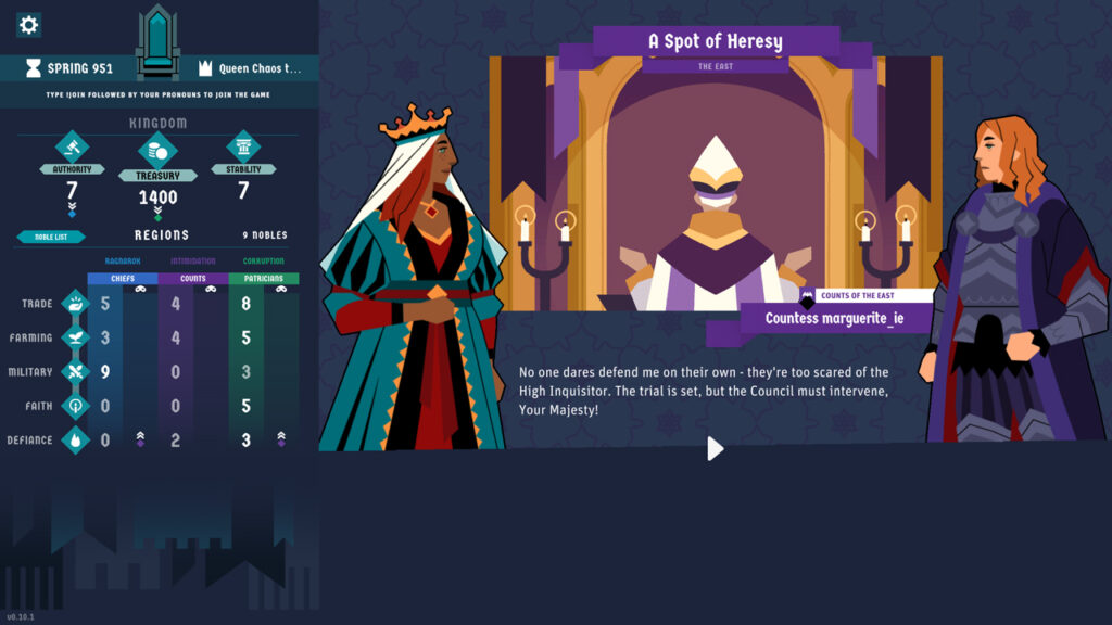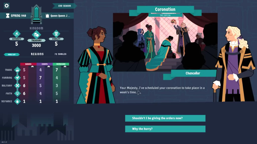 Хоча король має значну владу, вона не безмежна. Реалізація законів потребує підтримки фракцій, і кожне рішення підлягає голосуванню. Цей тонкий баланс між умиротворенням фракцій і досягненням власних цілей створює захоплюючий і стратегічний ігровий процес.