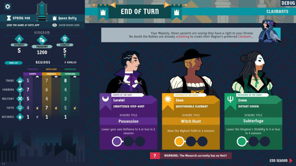 Щоб забезпечити своє місце на троні, ви повинні завершити три схеми, які є вашим шляхом до перемоги. Однак виживання має першочергове значення, оскільки вам потрібно створити спадкоємця та забезпечити плавний перехід влади. Ваші схеми можуть включати маніпулювання торгівлею, поширення процвітання або навіть формування армій. Взаємодія між фракціями та досягнення ваших цілей створюють насичений і захоплюючий ігровий процес.