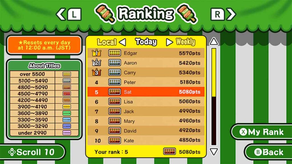 Score Attack: у цьому режимі гравці прагнуть приготувати якомога більше якіторі за ліміт часу, прагнучи отримати високу кількість балів, щоб потрапити в таблицю лідерів.