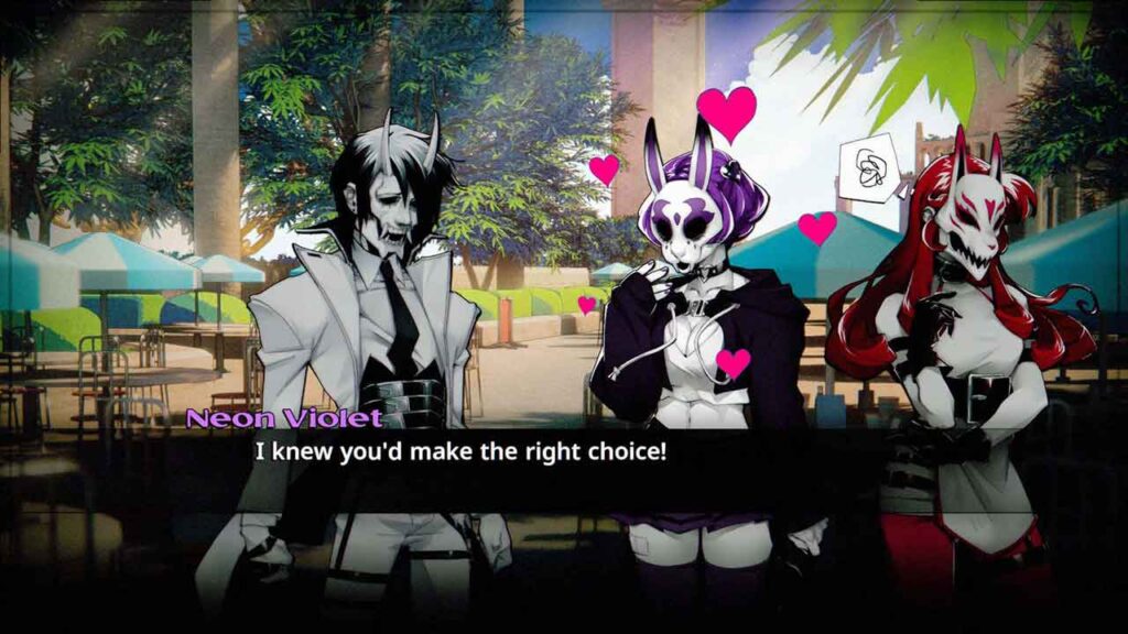 У Neon White ви граєте за нещодавно померлу людину, яка опинилася на небесах, стикаючись із серією складних випробувань на час, щоб отримати постійне місце серед ангелів. У грі представлена група яскравих персонажів, кожен з яких названий на честь кольору, як-от неоново-жовтий або неоново-зелений. Однак взаємодія розповіді та персонажів досить м’яка, залишаючи бажати кращого. Кат-сцени довгі та наповнені візуальними діалогами в стилі роману, які часто здаються радше клопотом, ніж частуванням. На щастя, ви можете пропустити ці сегменти, що є благословенням для тих, хто тут переважно заради ігрового процесу.